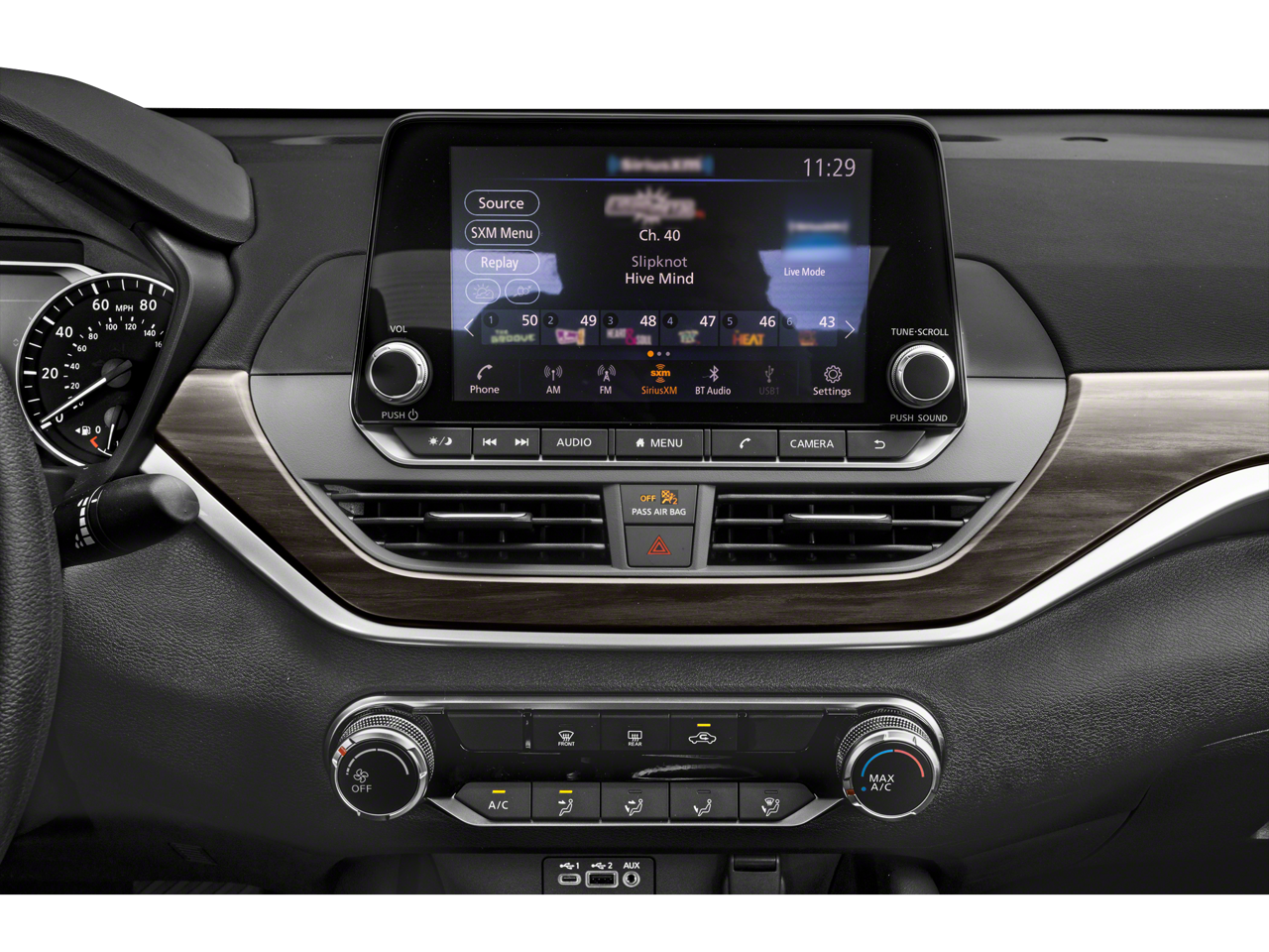 - Radio: AM/FM Audio System -inc: RDS, MP3 and aux-in, 6 speakers, NissanConnect featuring Apple CarPlay, Android Auto, 8" color touch-screen display, 1 front illuminated USB port (type-C) for compatible devices, SiriusXM radio w/advanced audio features, Bluetooth® hands-free phone system, streaming audio via Bluetooth®, hands-free text messaging assistant, Siri Eyes Free and Google Assistant voice recognition